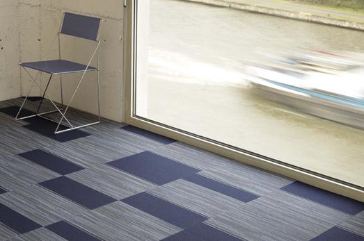 Carpet flooring in tiles sized 50 x 50 cm with loop cover. Recommended in office buildings - fitted for castered furniture and in rooms with floor heating. The highest quality carpet tile due to the unique way of weaving and fibre made in 100% of Econyl (nylon fibre from recycling). Floor covering available in two versions: homogenous and linear pattern on the same background.